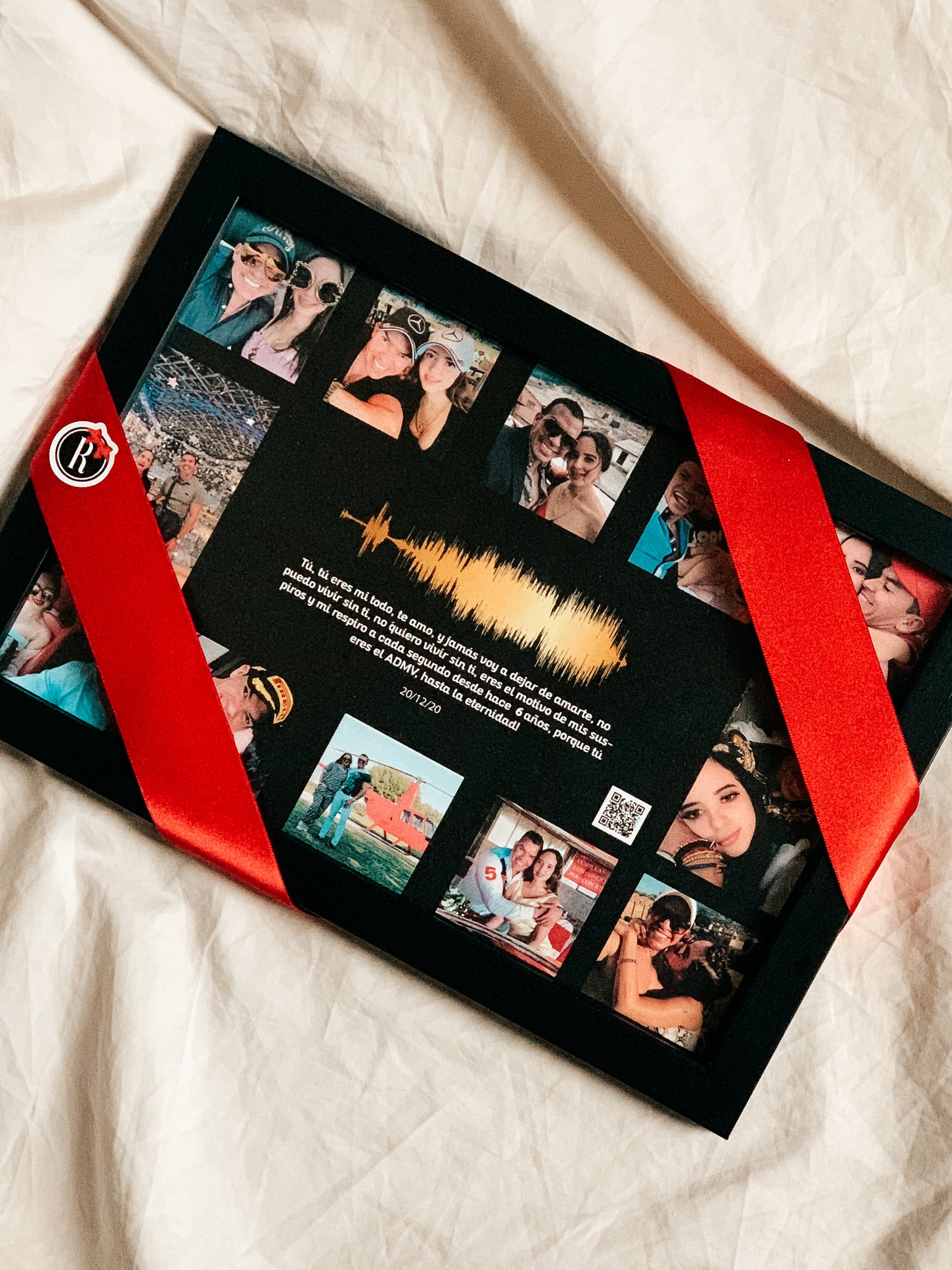 ¿Tienes una canción especial que quisieras recordar para siempre? El Cuadro con onda de sonido es perfecto para no olvidar esa ocasión, ya que le puede agregar la canción, con 12 fotos para recordar el momento, una frase, una fecha, y un código QR que lleva al video de esa canción.